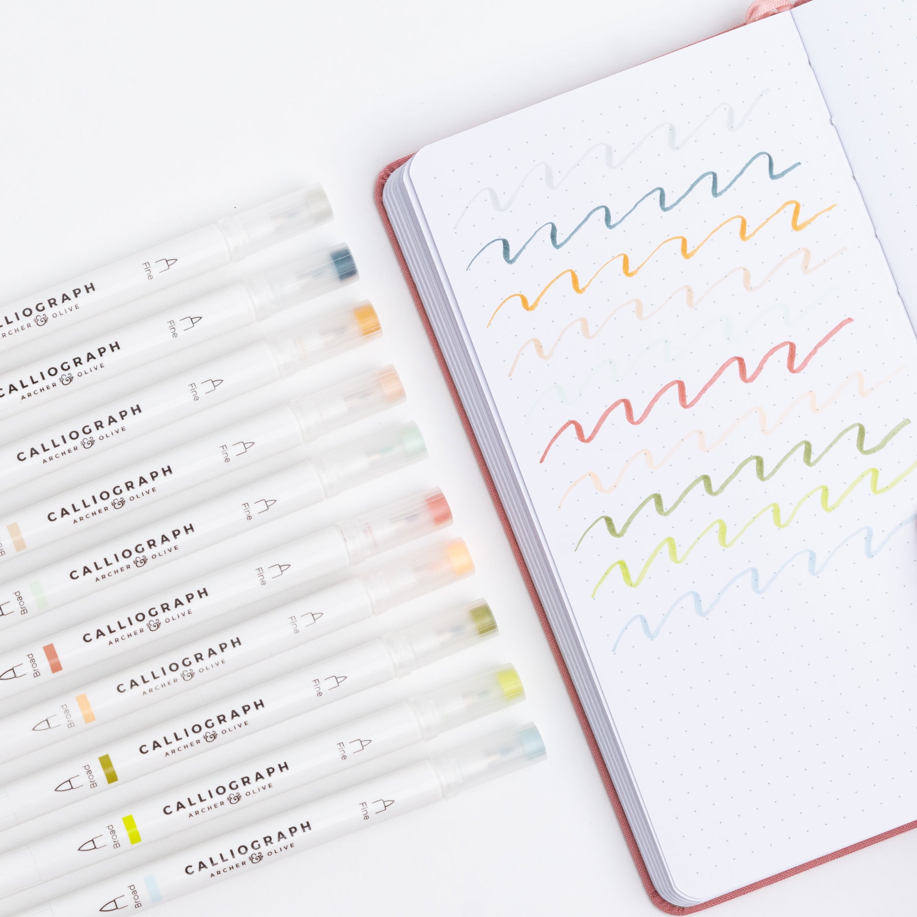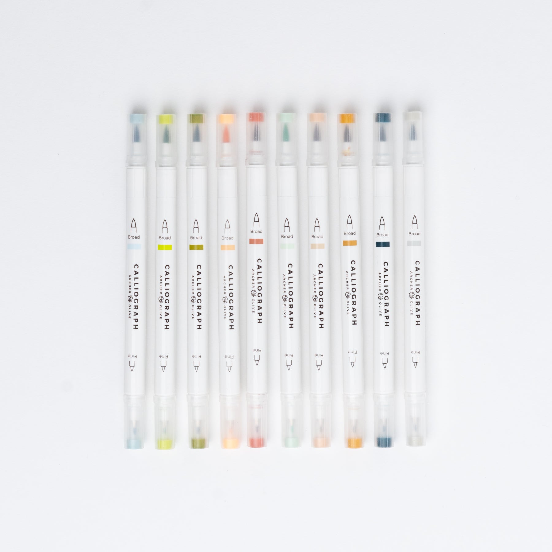 This set contains 10 Calliographs, which are dual-tipped brush pens, perfect for brush pen hand lettering, but are also great for highlighting, coloring and blending. Each has a large brush pen, with a fine tip brush pen on the other side, and is everything you need for calligraphy practice, faux calligraphy, study notes and detailed drawings. The 10 new colors included in this set are: