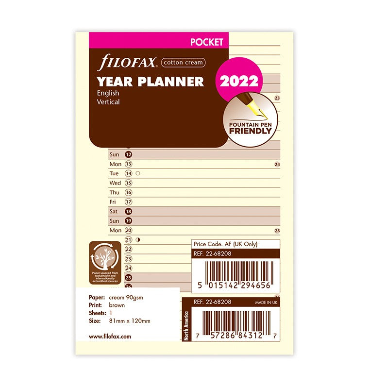 Plan your whole year with this pocket vertical format fold out 2022 year planner in luxury cotton cream. English language only.